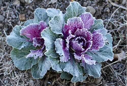 今朝も、よく晴れて冷え込みました。 居間の温度計は11度を示し、すでに真冬の寒さです。 アメダス、最低気温は氷点下2.7度(5:17)、なぜか、ポイント予報より3度も低温です。 裏のグランドは、降霜で真っ白に…。 「葉牡丹(はぼたん)」は、見事な「氷の花…