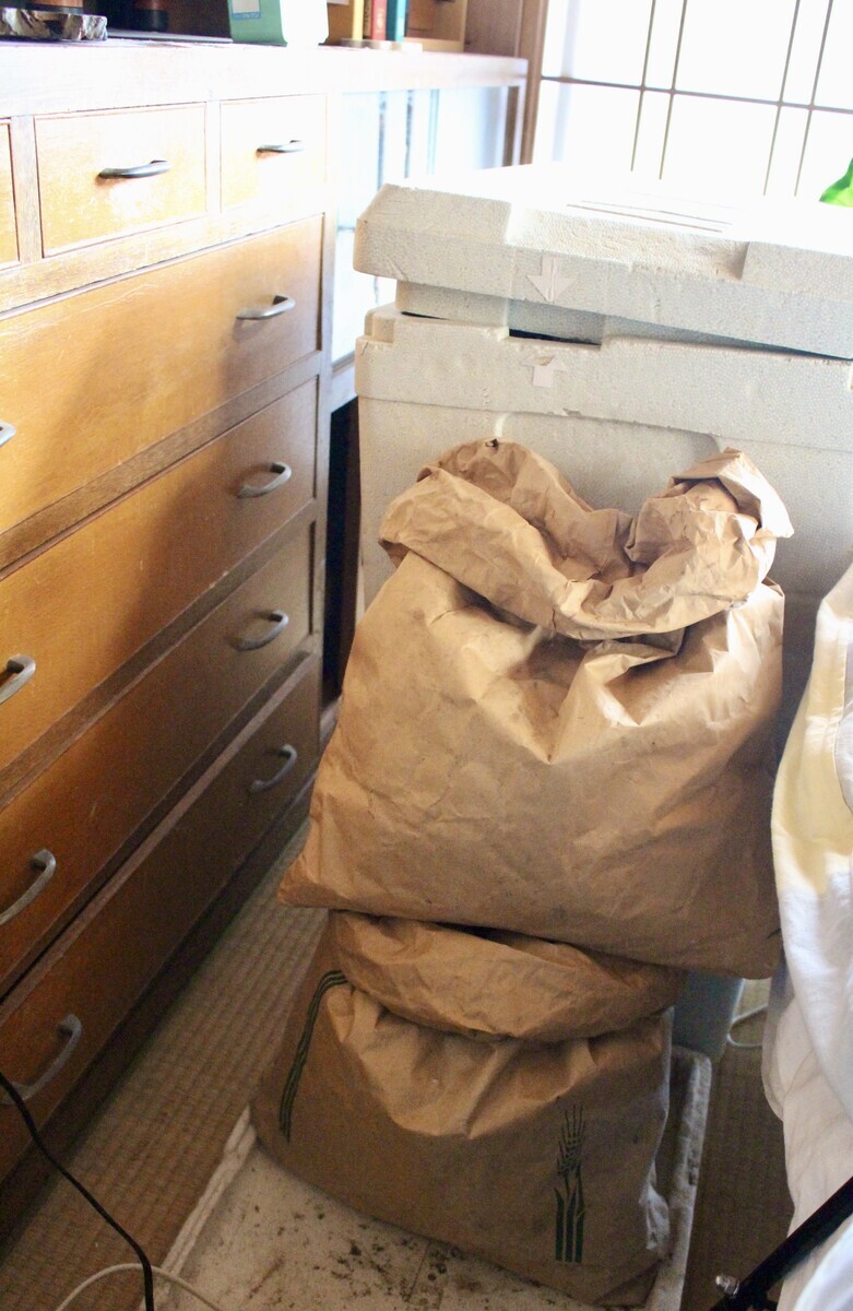 「米袋」に詰め、「籾殻」をかけて、部屋に取り込みました。